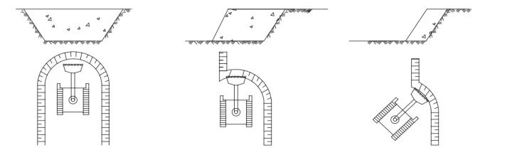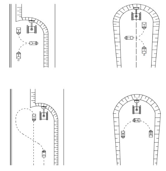 從實際的調度上來看,這個挖掘機(單斗挖掘機較多)要把礦石鏟裝到礦車上,就會涉及到一個礦車和挖掘機配合的問題,如何使得他們能合理的配合,一個礦車裝載完畢,另一個礦車就準備就緒,提高采裝效率?以下是一些礦車和挖掘機的相互配合示意圖,這是幾種常見的調車方式。