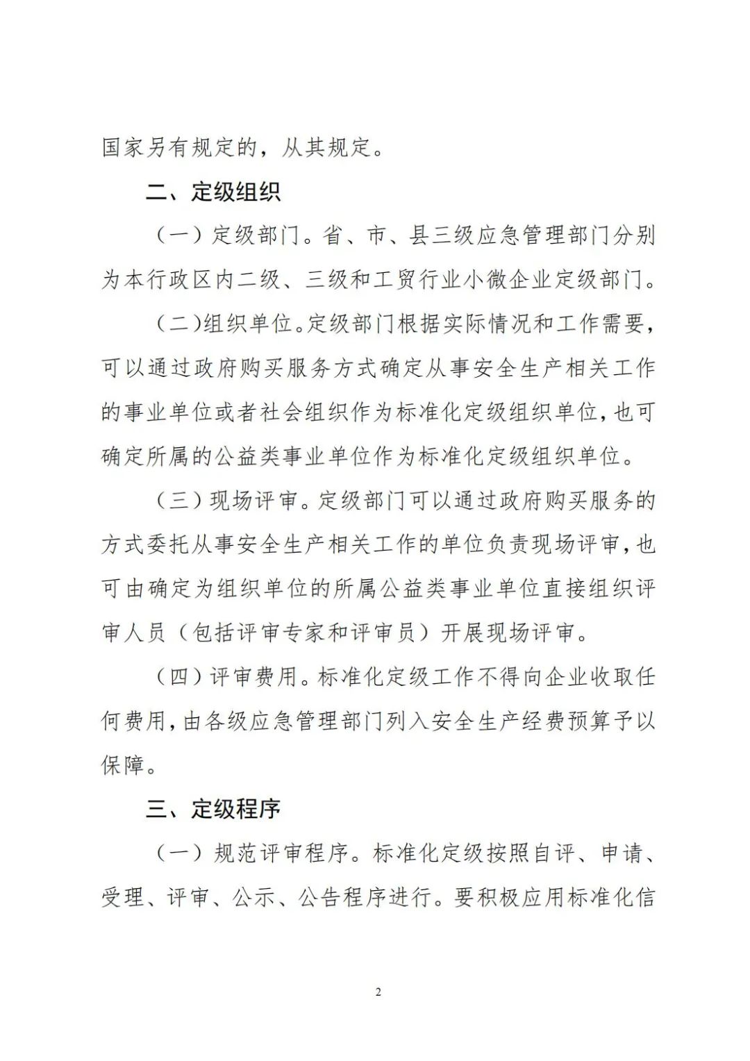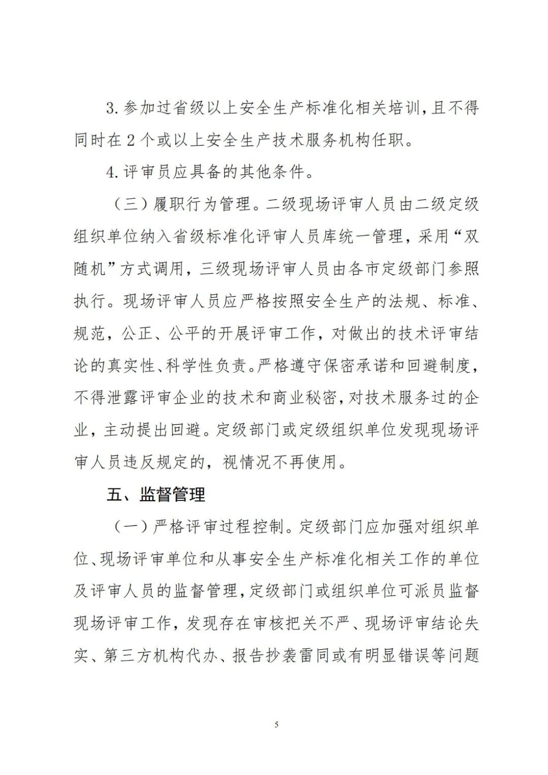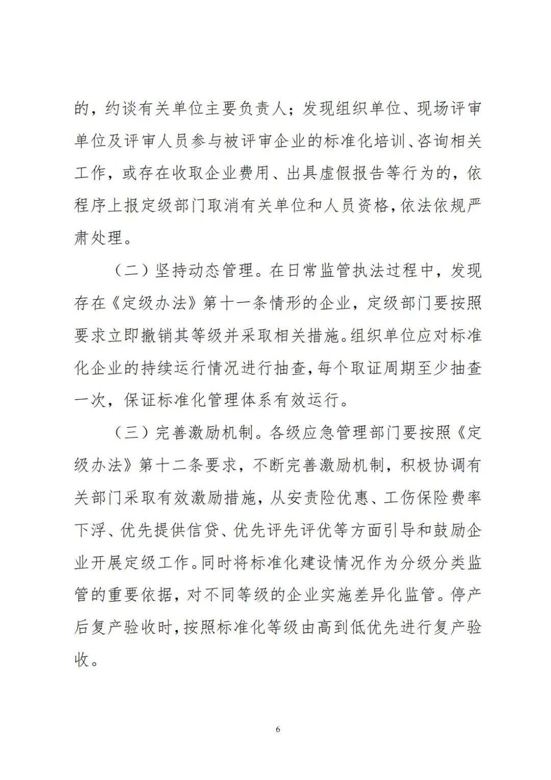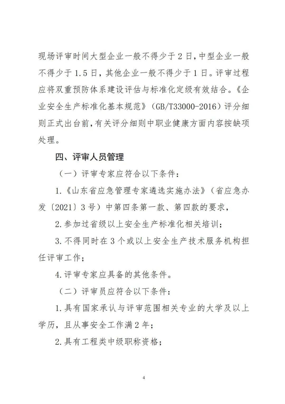 為認真貫徹實施《應急管理部關(guān)于印發(fā)〈企業(yè)安全生產(chǎn)標準化建設(shè)定級辦法〉的通知》(應急〔2021〕83號 ,以下簡稱《定級辦法》),進一步規(guī)范和促進我省安全生產(chǎn)標準化建設(shè)(以下簡稱標準化),現(xiàn)就做好全省標準化定級工作有關(guān)事項通知如下:全省非煤礦山、化工(含石油化工)、醫(yī)藥、危險化學品、煙花爆竹、石油開采(不含海洋石油)、冶金、有色、建材、機械、輕工、紡織、煙草、商貿(mào)等行業(yè)企業(yè)要按照《定級辦法》和本通知要求開展標準化定級工作。工貿(mào)行業(yè)具體范圍根據(jù)應急管理部辦公廳《關(guān)于修訂<冶金有色建材機械輕工紡織煙草商貿(mào)行業(yè)安全監(jiān)管分類標準(試行)>的通知》(應急廳〔2019〕17號)規(guī)定執(zhí)行。國家另有規(guī)定的,從其規(guī)定。(一)定級部門。省、市、縣三級應急管理部門分別為本行政區(qū)內(nèi)二級、三級和工貿(mào)行業(yè)小微企業(yè)定級部門。(二)組織單位。定級部門根據(jù)實際情況和工作需要,可以通過政府購買服務(wù)方式確定從事安全生產(chǎn)相關(guān)工作的事業(yè)單位或者社會組織作為標準化定級組織單位,也可確定所屬的公益類事業(yè)單位作為標準化定級組織單位。(三)現(xiàn)場評審。定級部門可以通過政府購買服務(wù)的方式委托從事安全生產(chǎn)相關(guān)工作的單位負責現(xiàn)場評審,也可由確定為組織單位的所屬公益類事業(yè)單位直接組織評審人員(包括評審專家和評審員)開展現(xiàn)場評審。(四)評審費用。標準化定級工作不得向企業(yè)收取任何費用,由各級應急管理部門列入安全生產(chǎn)經(jīng)費預算予以保障。(一)規(guī)范評審程序。標準化定級按照自評、申請、受理、評審、公示、公告程序進行。要積極應用標準化信息化系統(tǒng),做到網(wǎng)上審報、受理及動態(tài)管理,實現(xiàn)材料“無紙化”和過程“零跑腿”。(二)嚴格創(chuàng)建條件。企業(yè)應當自主開展標準化建設(shè),做到全員參與。企業(yè)創(chuàng)建不得委托第三方機構(gòu)包辦,創(chuàng)建初期確需技術(shù)支持的,可聘請安全生產(chǎn)技術(shù)服務(wù)機構(gòu)或?qū)<覟槠髽I(yè)提供咨詢和培訓服務(wù)。企業(yè)申請除符合《定級辦法》第八條的共性條件外,還應符合:申請二級定級的企業(yè)申請之日前3年內(nèi)未發(fā)生過生產(chǎn)安全死亡事故,統(tǒng)計分析事故起數(shù)、千人重傷率、傷害嚴重率等逐年下降或者持平,曾被定為三級及以上等級并有效運行3年以上。行業(yè)領(lǐng)先的新設(shè)立企業(yè),積極開展標準化創(chuàng)建工作有效運行3年以上,可直接申請二級定級。申請三級定級的企業(yè)申請之日前2年內(nèi)未發(fā)生過生產(chǎn)安全死亡事故,統(tǒng)計分析事故起數(shù)、千人重傷率、傷害嚴重率等逐年下降或者持平。(三)嚴把評審質(zhì)量,F(xiàn)場評審應選擇符合專業(yè)要求的評審專家和評審員組成現(xiàn)場評審組,其中,二級定級現(xiàn)場評審專家一般不得少于5人,三級一般不得少于3人。現(xiàn)場評審時間大型企業(yè)一般不得少于2日,中型企業(yè)一般不得少于1.5日,其他企業(yè)一般不得少于1日。評審過程應將雙重預防體系建設(shè)評估與標準化定級有效結(jié)合。《企業(yè)安全生產(chǎn)標準化基本規(guī)范》(GB/T33000-2016)評分細則正式出臺前,有關(guān)評分細則中職業(yè)健康方面內(nèi)容按缺項處理。1.《山東省應急管理專家遴選實施辦法》(省應急辦發(fā)〔2021〕3號)中第四條第一款、第四款的要求,2.參加過省級以上安全生產(chǎn)標準化相關(guān)培訓;3.不得同時在3個或以上安全生產(chǎn)技術(shù)服務(wù)機構(gòu)擔任評審工作;1.具有國家承認與評審范圍相關(guān)專業(yè)的大學及以上學歷,且從事安全工作滿2年;3.參加過省級以上安全生產(chǎn)標準化相關(guān)培訓,且不得同時在2個或以上安全生產(chǎn)技術(shù)服務(wù)機構(gòu)任職。(三)履職行為管理。二級現(xiàn)場評審人員由二級定級組織單位納入省級標準化評審人員庫統(tǒng)一管理,采用“雙隨機”方式調(diào)用,三級現(xiàn)場評審人員由各市定級部門參照執(zhí)行,F(xiàn)場評審人員應嚴格按照安全生產(chǎn)的法規(guī)、標準、規(guī)范,公正、公平的開展評審工作,對做出的技術(shù)評審結(jié)論的真實性、科學性負責。嚴格遵守保密承諾和回避制度,不得泄露評審企業(yè)的技術(shù)和商業(yè)秘密,對技術(shù)服務(wù)過的企業(yè),主動提出回避。定級部門或定級組織單位發(fā)現(xiàn)現(xiàn)場評審人員違反規(guī)定的,視情況不再使用。(一)嚴格評審過程控制。定級部門應加強對組織單位、現(xiàn)場評審單位和從事安全生產(chǎn)標準化相關(guān)工作的單位及評審人員的監(jiān)督管理,定級部門或組織單位可派員監(jiān)督現(xiàn)場評審工作,發(fā)現(xiàn)存在審核把關(guān)不嚴、現(xiàn)場評審結(jié)論失實、第三方機構(gòu)代辦、報告抄襲雷同或有明顯錯誤等問題的,約談有關(guān)單位主要負責人;發(fā)現(xiàn)組織單位、現(xiàn)場評審單位及評審人員參與被評審企業(yè)的標準化培訓、咨詢相關(guān)工作,或存在收取企業(yè)費用、出具虛假報告等行為