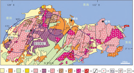 1—第四系;2—新近系、古近系;3—白堊系;4—古-新元古界;5—含榴輝巖的新元古代花崗質(zhì)片麻巖;6—太古宙花崗-綠巖帶;7—白堊紀嶗山花崗巖;8—白堊紀偉德山花崗巖;9—白堊紀郭家?guī)X花崗閃長巖;10—侏羅紀花崗巖類;11—三疊紀花崗巖類;12—斷層;13—大-特大型金礦床/中小型金礦床;14—金成礦小區(qū)范圍及編號;15—金成礦帶位置及編號;16—金礦田編號。MEI—膠西北成礦小區(qū);ME2—棲蓬福成礦小區(qū);ME3—牟乳成礦小區(qū)。MB1—三山島金礦帶;MB2—焦家金礦帶;MB3—招平金礦帶;MB4—棲霞-大柳行金礦帶;MB5—桃村金礦帶;MB6—牟乳金礦帶。OF1—三山島金礦田;0F2—焦家金礦田;OF3—靈北金礦田;0F4—鞍石金礦田;OF5—大莊子金礦田;OF6—玲瓏金礦田;OF7—大尹格莊金礦田;OF8—舊店金礦田;0F9—棲霞金礦田;OF10—大柳行金礦田;OF11—萊山金礦田;OF12—蓬家夼金礦田;OF13—鄧格莊金礦田
