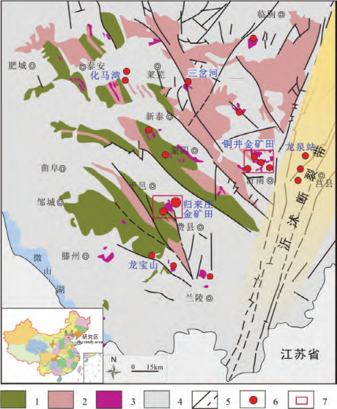 1.2 魯西地區(qū)成礦地質(zhì)特征與礦床類型魯西地區(qū)的金礦床主要分布在郯廬斷裂帶以西的平邑、沂南、蘭陵、萊蕪等地,區(qū)內(nèi)廣泛出露新太古代泰山巖群及寒武—奧陶紀和中—新生代地層。郯廬斷裂帶的次級NW—NNW向斷裂構造發(fā)育,形成了由NW向SE收斂的帚狀構造格架,這些斷裂構造及其次級斷裂控制著區(qū)內(nèi)地層、巖漿巖及金礦床的展布,中生代中—基性和中偏堿性巖漿活動與金礦形成密切相關。主要金礦類型有以平邑歸來莊金礦田為代表的隱爆角礫巖型金礦和以沂南銅井銅金礦田為代表的矽卡巖型金礦(圖2)。