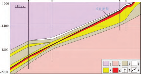 萊州三山島北部海域及西嶺村金礦床是近年來深部勘查發(fā)現(xiàn)的2個超大型金礦,其中三山島北部海域金礦床位于三山島斷裂北延入海的地段,是淺海中的隱伏礦床,海水深度8.5~20m,控制最大礦體長度達1744m,最大斜深1252m,最大垂深2000余米(圖8),查明資源量為470余噸,礦體平均厚度6.8m,平均品位4.3X10-6,是我國目前規(guī)模最大的單體金礦床。