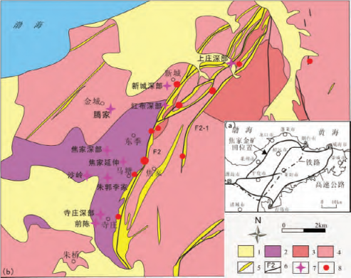 圖3焦家金礦田區(qū)域位置(a)及礦田地質(zhì)圖(b)