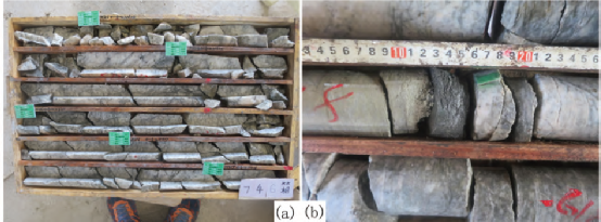 (a)近3000m深部焦家蝕變帶特征;(b)焦家主斷裂面斷層泥(中間黑色部分)