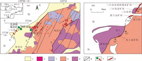 圖7 膠西北區(qū)域地質(zhì)圖(a)和三山島斷裂附近基巖地質(zhì)圖(b)