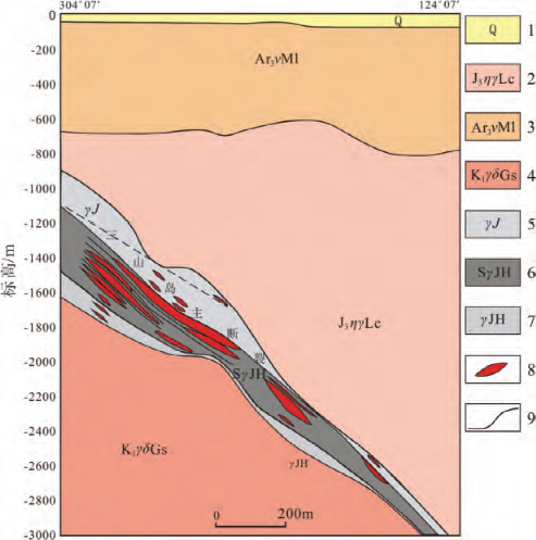 1—第四系;2—晚侏羅世玲瓏二長花崗巖;3—馬連莊序列變輝長巖;4—早白堊世郭家?guī)X花崗巖;5—絹英巖化花崗巖;6—黃鐵絹英巖化花崗閃長質(zhì)碎裂巖;7—黃鐵絹英巖化花崗巖;8—金礦體;9—主斷裂.