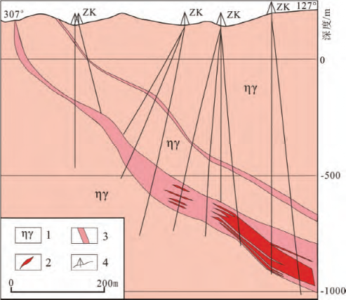 1—二長花崗巖;2—礦體;3—礦化帶;4—鉆孔.