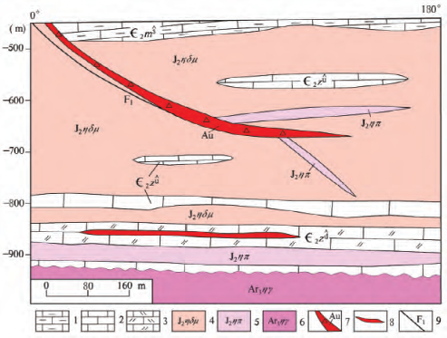 1—寒武紀長清群饅頭組石店段泥灰?guī)r;2—長清群朱砂洞組上灰?guī)r段灰?guī)r;3—朱砂洞組丁家莊段白云質(zhì)灰?guī)r;4—燕山早期二長閃長玢巖;5—燕山早期二長斑巖;6—新太古代二長花崗巖;7—隱爆角礫巖型金礦體;8—似層狀碳酸鹽巖微細浸染型金礦體;9—斷裂及編號.
