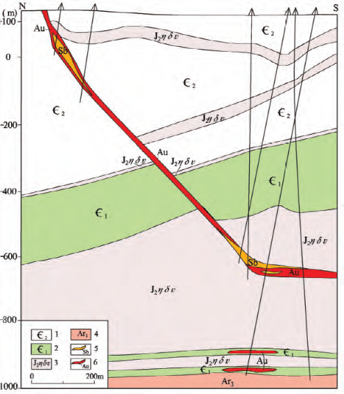 1—寒武-奧陶紀三山子組+炒米店組+崮山組;2—寒武紀張夏組+饅頭組+朱砂洞組;3—侏羅紀二長閃長玢巖;4—前寒武紀變質(zhì)基底;5—蝕變角礫巖;6—金礦體.