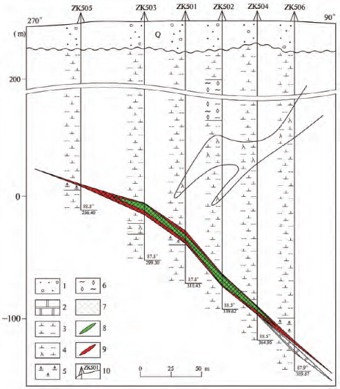 1—第四系;2—大理巖;3—黑云母閃長巖;4—黑云母閃長玢巖;5—蝕變閃長巖;6—綠泥石化碳酸鹽化蝕變巖;7—矽卡巖;8—鐵礦體;9—金礦體;10—鉆孔及編號.
