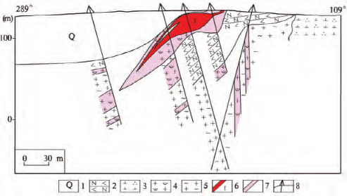 萊蕪三岔河鐵金礦是近年來在魯西萊蕪地區(qū)新發(fā)現(xiàn)的鐵金礦床,礦區(qū)位于萊蕪市鋼城區(qū)里辛鎮(zhèn)北約7km處,大地構造位置位于魯中隆起中的泰萊凹陷東南部。該礦床探明金金屬量近7t,鐵礦石量19萬t,伴生銀金屬6t,盡管礦床規(guī)模不大,但是在金礦資源不足的魯西萊蕪地區(qū)發(fā)現(xiàn),意義重大,且僅開展了淺部勘查,深部資源潛力巨大。礦體賦存在燕山晚期沂南序列大有單元黑云母閃長巖巖體內(nèi)的馬家溝群灰?guī)r捕擄體附近。賦礦巖性主要為礦化矽卡巖和蝕變閃長巖。該礦床只有一個礦體,礦體賦存標高在+9.26m~-120.48m間,形態(tài)及產(chǎn)狀變化較穩(wěn)定,呈似層狀、透鏡狀,局部形態(tài)受捕擄體形態(tài)及構造控制發(fā)生變化。礦體沿走向呈舒緩“V”狀,走向近SN,傾向E,礦體長587m,控制最大斜深216m,平均真厚度4.65m。與金礦體共生的鐵礦體被金礦體包裹,礦體走向長515m,控制最大斜深130m(圖16)。近礦體處圍巖蝕變、礦化發(fā)育,主要有矽卡巖化、磁鐵礦化、黃鐵礦化、黃銅礦化、綠泥石化及碳酸鹽化等。礦石類型主要為磁鐵礦化矽卡巖型(金礦石)和黃鐵礦化磁鐵礦化矽卡巖型(金鐵礦石)。