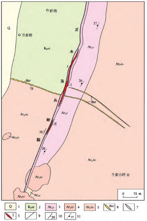 1—第四系;2—新太古代二長花崗巖;3—韌性剪切帶;4—破碎帶韌性剪切帶;5—白堊紀馬郎溝組;6—中生代花崗斑巖;7—破碎帶;8—斷裂;9—新太古代英云閃長巖;10—基性巖脈;11—金礦體.
