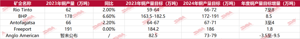 目前部分礦企已發(fā)布最新的季度產(chǎn)量報告和2024年的銅產(chǎn)量指導量,SMM匯總了目前已公布的信息數(shù)據(jù)。如下圖所示:
