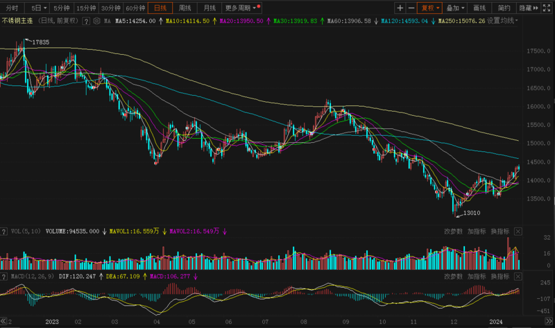 2023年以來(lái)不銹鋼主連整體呈震蕩下跌的趨勢(shì),1月30日的17470元/噸為年內(nèi)價(jià)格最高點(diǎn);12月6日刷2020年11月19日以來(lái)新低至13010元/噸,為年內(nèi)最低點(diǎn),年內(nèi)最大跌幅為25.53%,年度跌幅為18.38%。