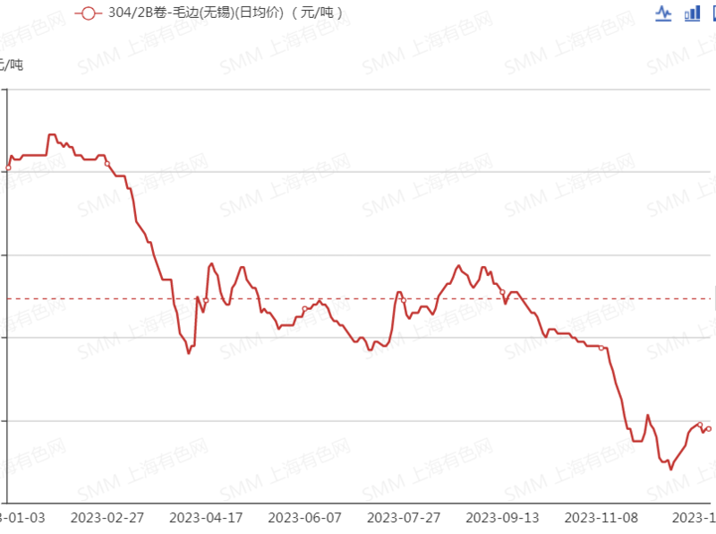 2023年304/2B卷-毛邊(無(wú)錫)現(xiàn)貨均價(jià)整體呈震蕩走弱的趨勢(shì),年內(nèi)最大跌幅為23.21%,年度跌幅為18.71%。