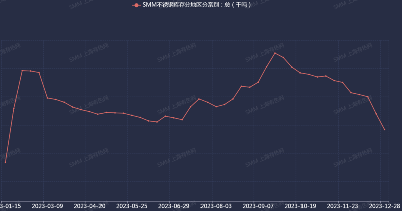 庫(kù)存:據(jù)SMM數(shù)據(jù)顯示,2023年國(guó)內(nèi)不銹鋼分地區(qū)分系別總庫(kù)存呈震蕩走勢(shì)變化,9月21日庫(kù)存觸及2021年3月以來(lái)新高后持續(xù)去庫(kù),12月28日庫(kù)存為74.2萬(wàn)噸,刷2023年1月以來(lái)新低,環(huán)比減約3.62%,同比增9.34%。2023年不銹鋼產(chǎn)量以及表觀消費(fèi)同比增加較多,社會(huì)庫(kù)存同比增加屬于正,F(xiàn)象。