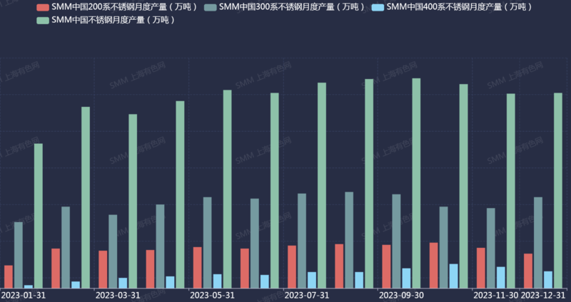 供應(yīng)端:產(chǎn)量方面,2023年國(guó)內(nèi)不銹鋼月度總產(chǎn)量以及各系不銹鋼月度產(chǎn)量整體表現(xiàn)相對(duì)平穩(wěn),12月庫(kù)存環(huán)比增1萬(wàn)噸,同比增9萬(wàn)噸。